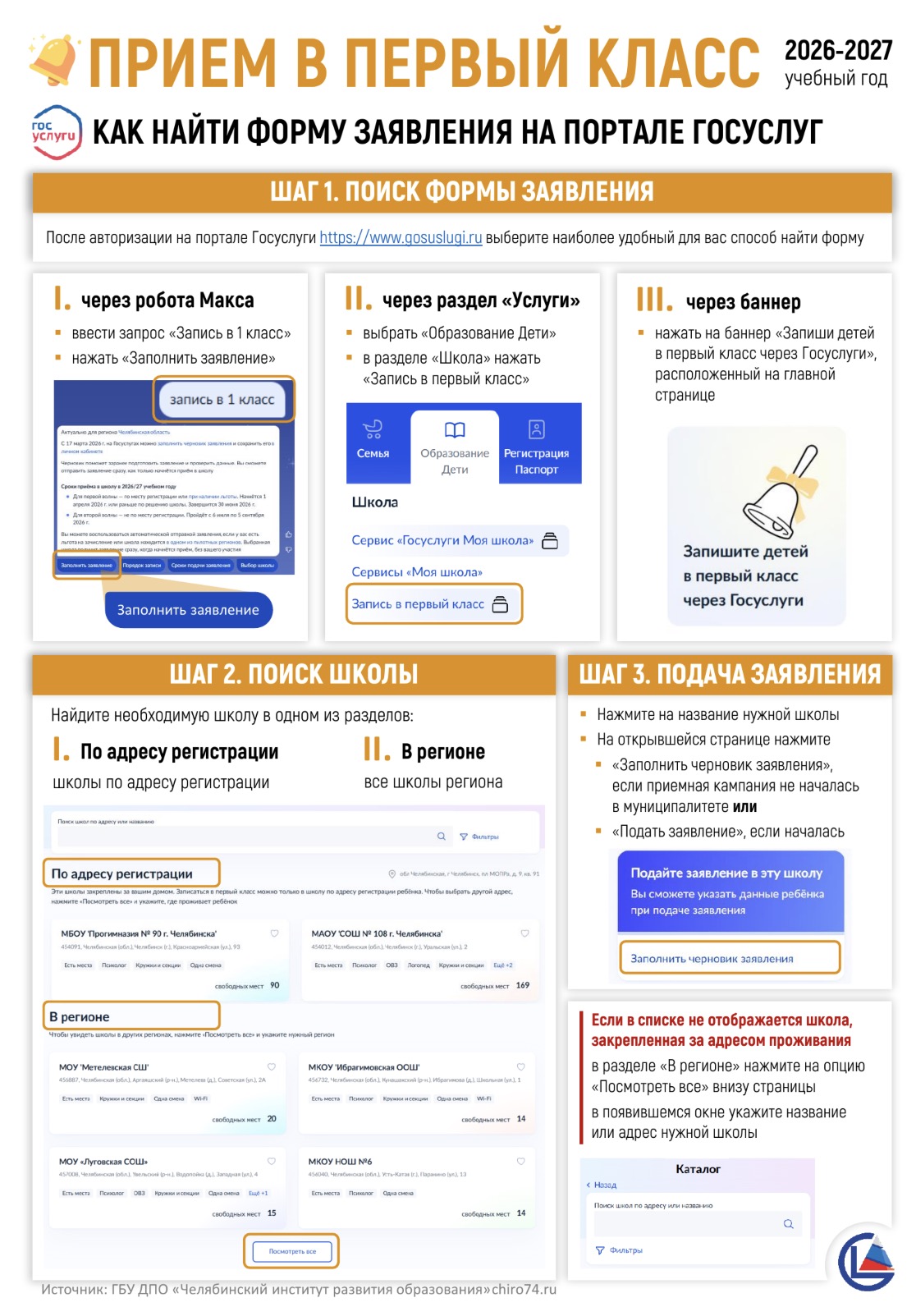 В соответствии с обновленными Едиными функциональными техническими требованиями к реализации на ЕПГУ универсальной формы «Запись в 1 класс» запущен «Сервис подбора школ». Если в ходе работы сервиса Вы столкнулись с ситуацией, когда он некорректно подбирает образовательную организацию по указанным критериям (адресу места жительства или льготам) рекомендуем действовать по следующему алгоритму: 1. В подразделе «В регионе» нажать на кнопку «Посмотрите все». 2. В строке поиска вручную указать юридический адрес образовательной организации, в которую планируется подача заявления (юридический адрес образовательной организации необходимо найти в приложении к распоряжению «Закрепление муниципальных общеобразовательных учреждений города Челябинска за территориями города Челябинска», размещенном на официальном сайте Комитета в разделе «Родителю», далее – «Прием обучающихся в первые классы»). 3. Выбрать нужную организацию из предложенного системой списка. 4. Сформировать черновик заявления. Обращаем внимание, что дата создания «черновика» не влияет на дату регистрации самого заявления в школу. Черновик можно создавать, удалять, редактировать до даты начала приема заявлений. В заявлении будут учитываться дата и время отправки «черновика», а не его регистрации. Дата и время отправки заявления не может быть ранее даты начала приема заявлений, то есть не ранее 09:00 часов 27.03.2026. |